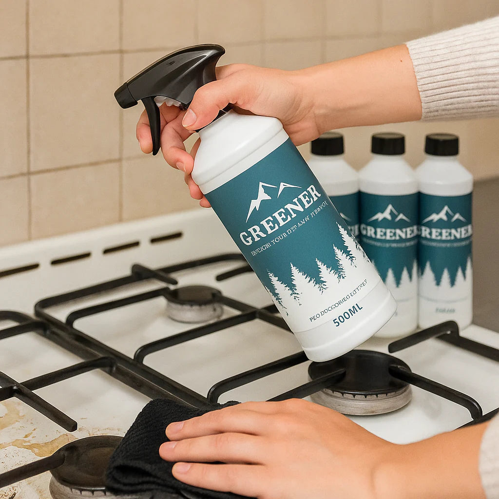 Greener Concentrated disuelve la grasa de forma rápida y segura, dejando tu cocina impecable sin dañar las superficies ni dejar residuos químicos.
